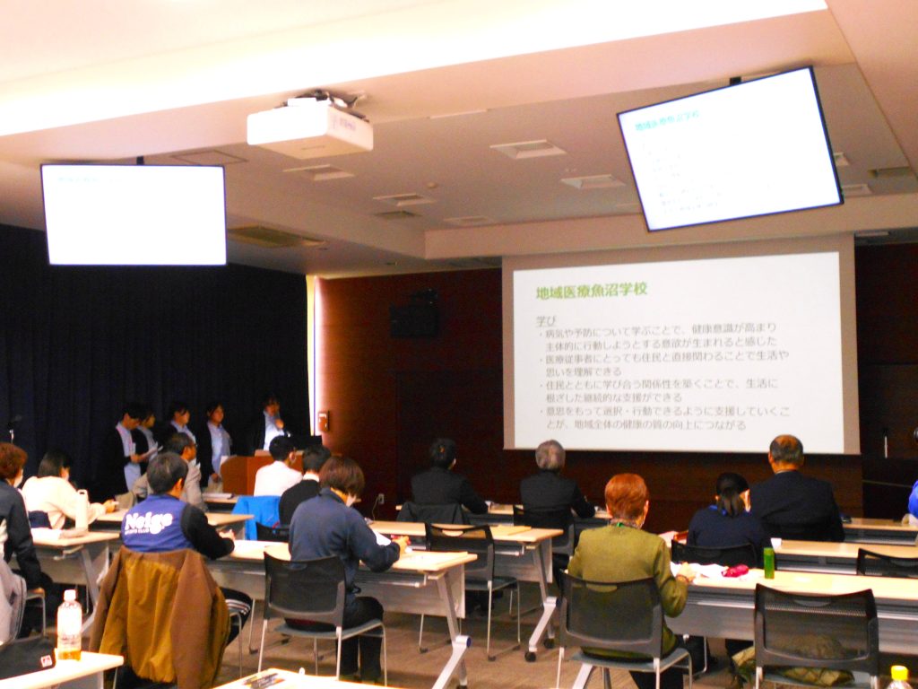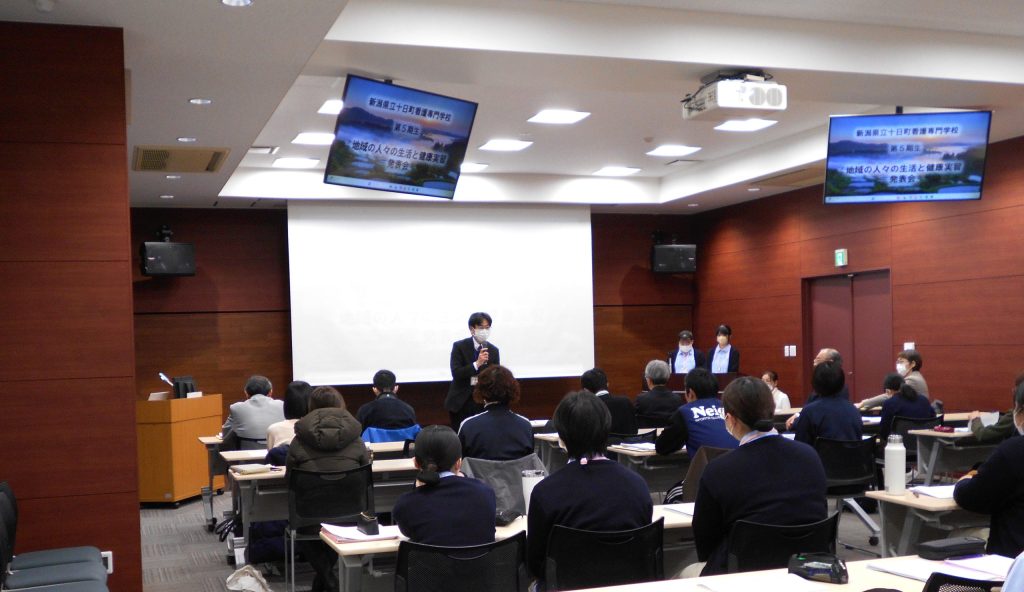 2月3日(火)の発表会には実習にご協力いただいた各施設から多くの方々にご参加いただき、「十日町の人々がどのようにして健康増進に取り組んでいるのか」や、「健康をサポートするための様々な取り組み」について学びを発表しました。自分たちが考える健康支援についての取り組みの発表では各グループから独創的な意見が聞かれました。